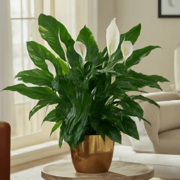 Popular indoor plant, Peace Lily is highly regarded for their stunning leaves and ability to purify the air. Its leaves are glossy, thin ovals with a dark green color. Around the plant's base, the leaves normally grow in a symmetrical pattern.